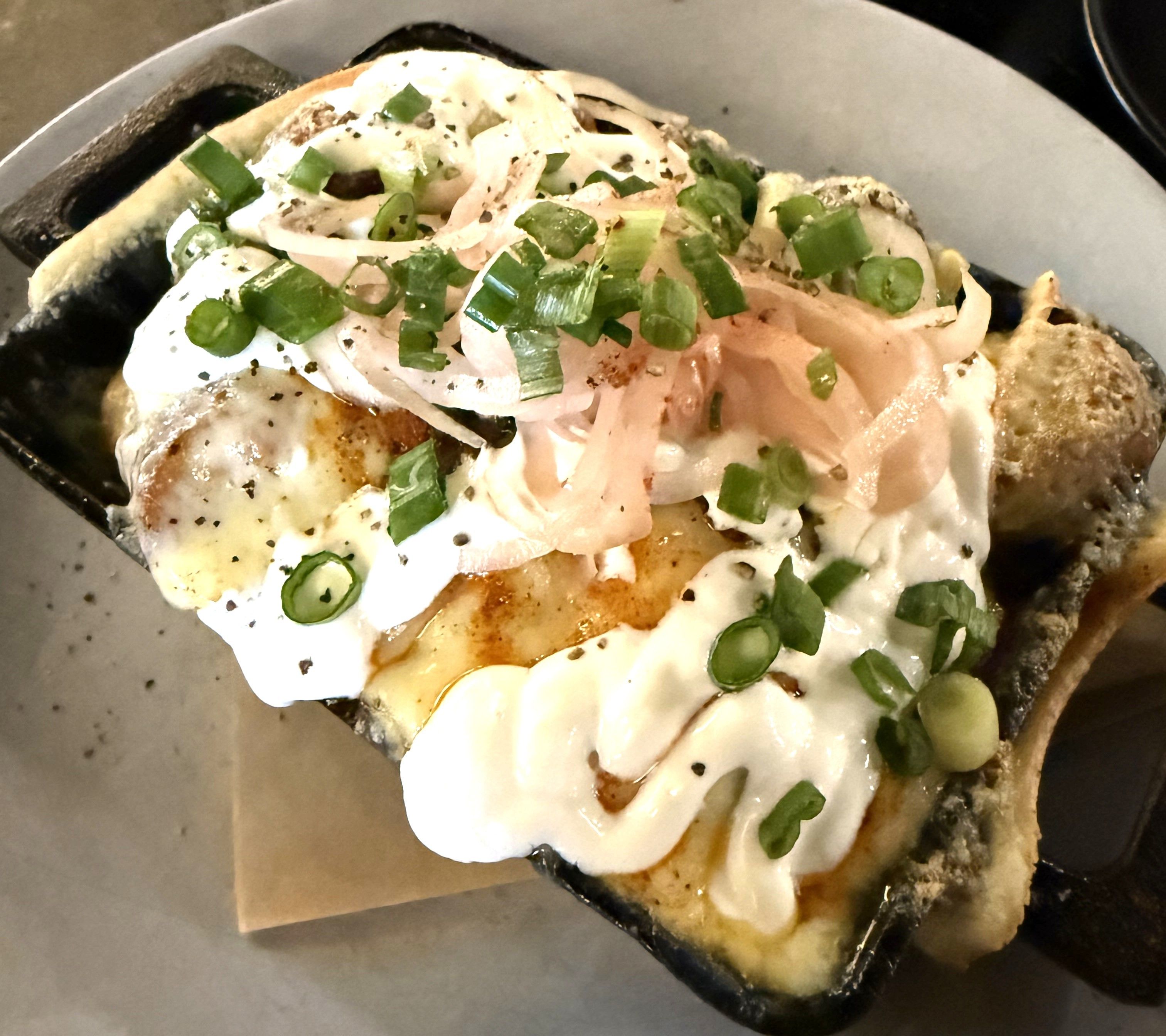 Then came the Raclette Potatoes, which deserve their own paragraph: roasted fingerlings with crumbled bacon, Spring Brook Farm raclette, Cabot cheddar, house fire rub, lemon crema, pickled shallots, and scallions. It's a lot happening on one plate, and every bit of it worked. We couldn't stop eating it.