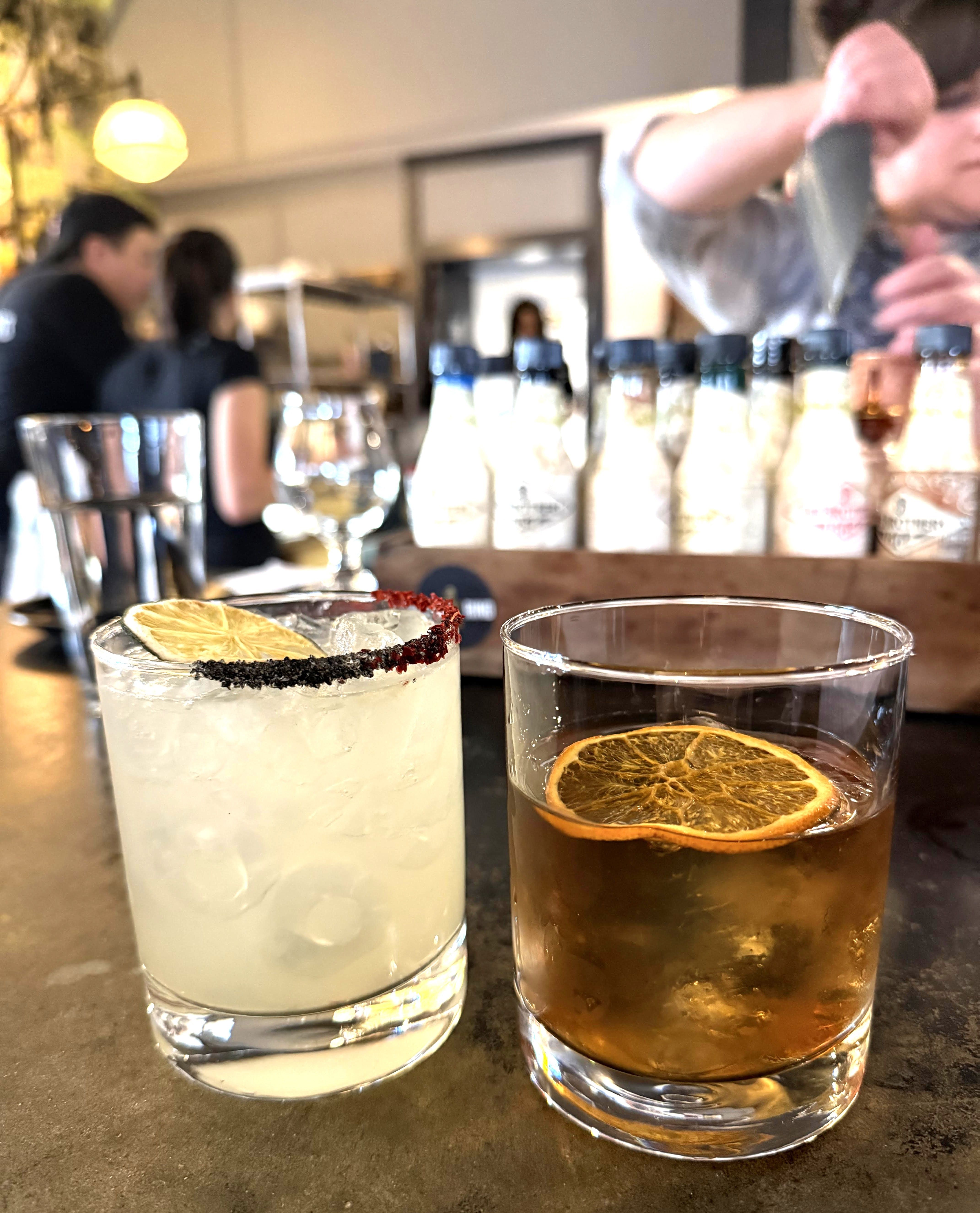 The cocktail program is serious in the best way…the bar in front of us was lined with a collection of specialty bitters that told you what their priorities are. I made my typical cold weather move with the Brown Butter Bourbon Old Fashioned: washed bourbon, black walnut bitters, simple syrup on the rocks. Classic, perfectly executed, hit the spot. Mike had the Coconut S&R…reposado tequila, lime, house coconut syrup, orange bitters, black salt, dehydrated lime. His was was considerably more adventurous and equally good.