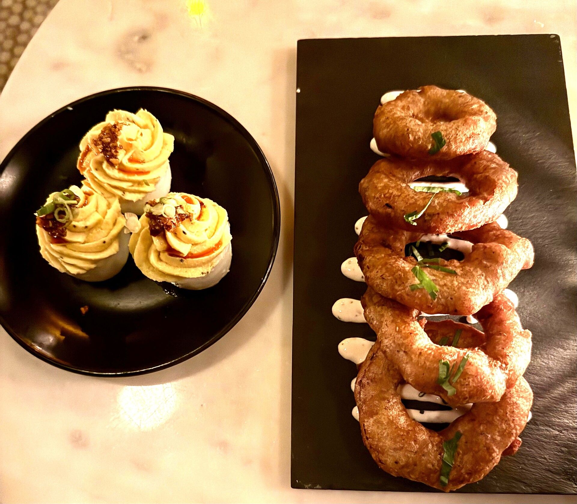 The snacks are also outstanding. We didn’t even order meat (which, if you know Mike, tells you everything). We went for the Spaghett-O Rings (Aperol & High Life–battered delicata squash rings with lemon–black pepper–horseradish crema) and the deviled eggs with chili crisp, scallion and togarashi. Both excellent. Both gone in about 90 seconds.