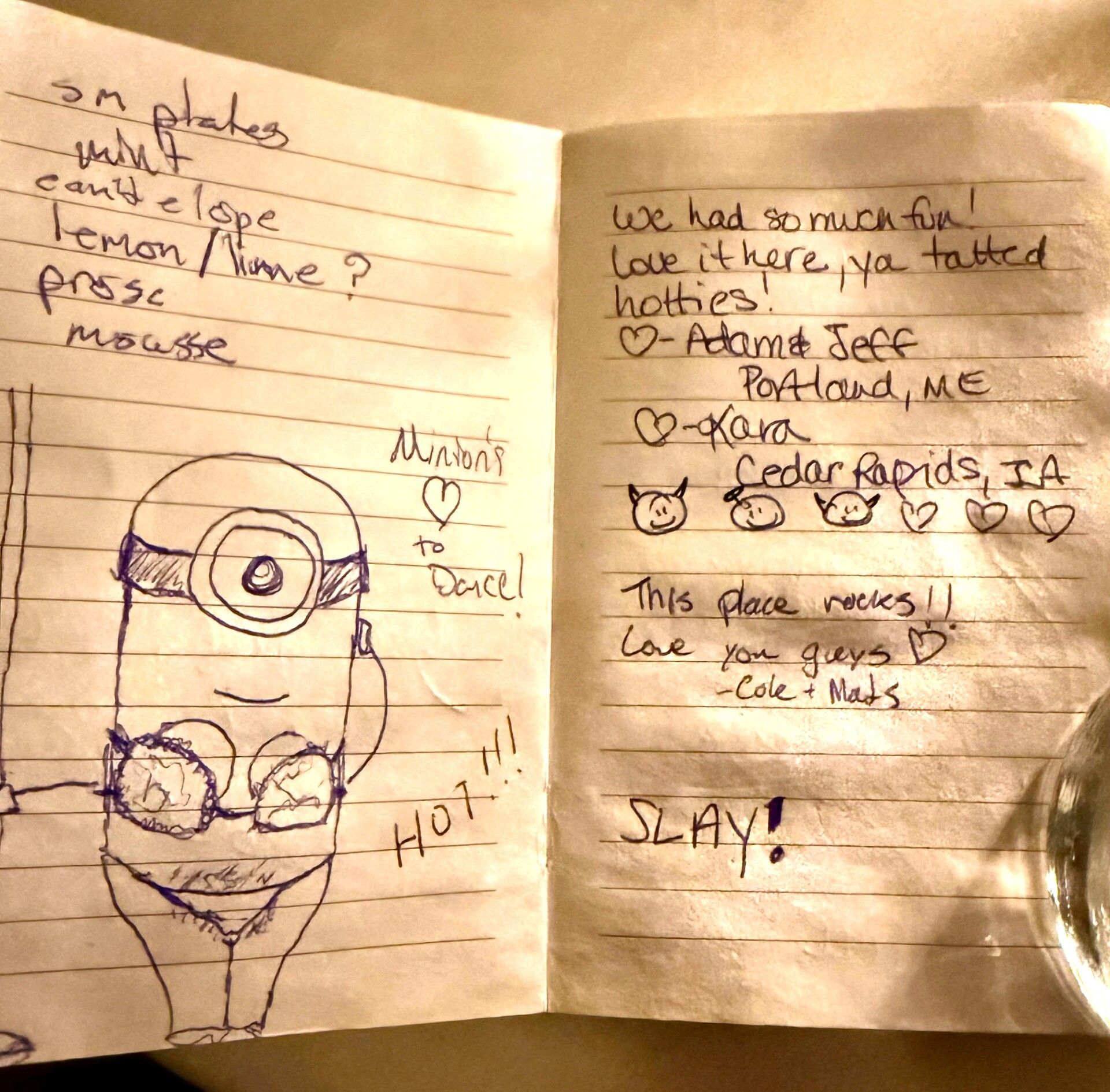 And then there’s the check presentation. Your bill arrives inside a tiny notebook full of notes and drawings from past guests. Ours included a Minion in lingerie and a few messages that… well, let’s just say I hope those people got home safely.