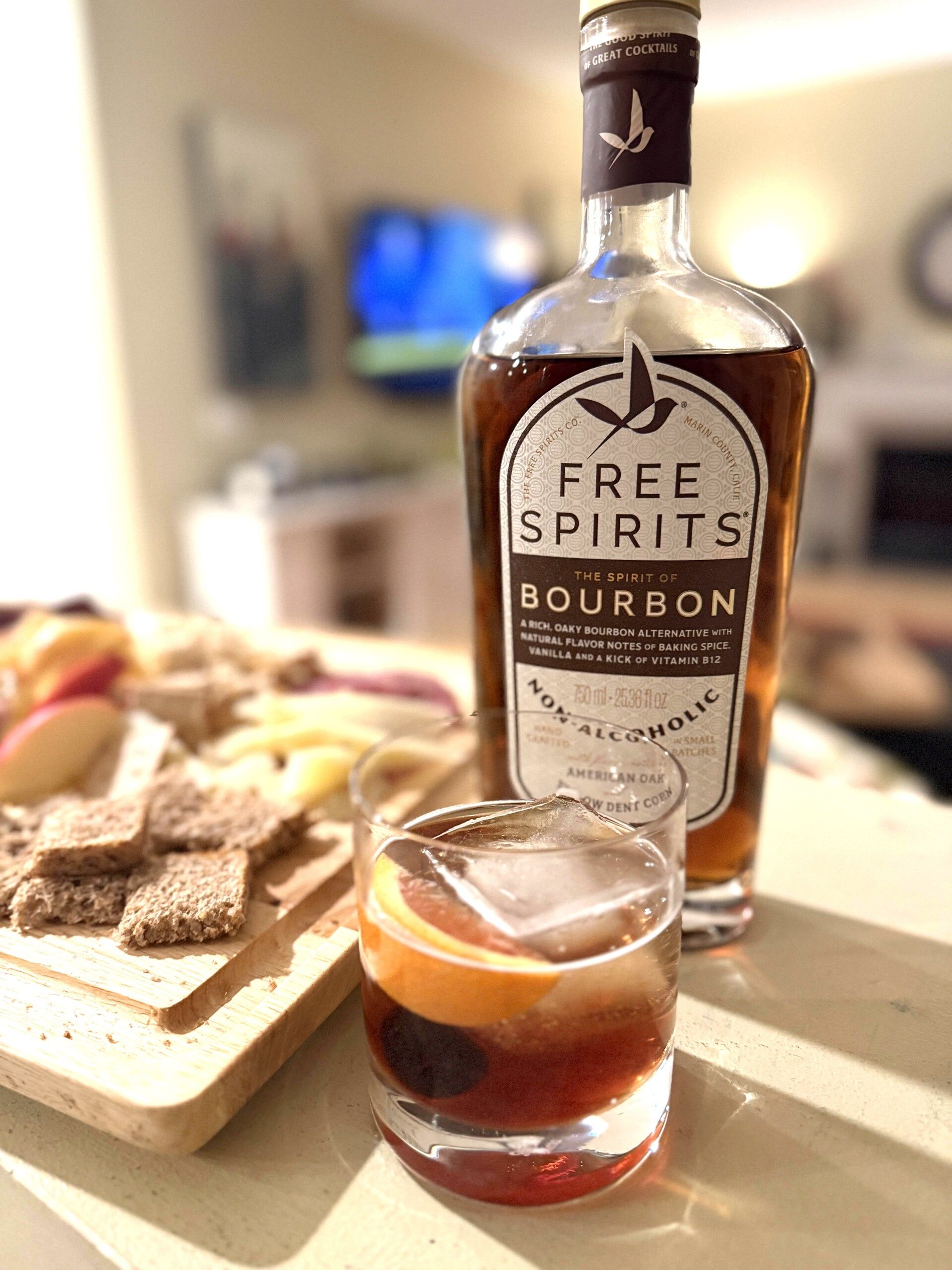 Fortunately, we’d picked up a bottle of Free Spirits bourbon, so Mike stepped into bartender mode and put together a sort of old-fashioned “adjacent” concoction: the NA bourbon, lavender bitters, simple syrup, a dash of blood orange, and a slice of orange.