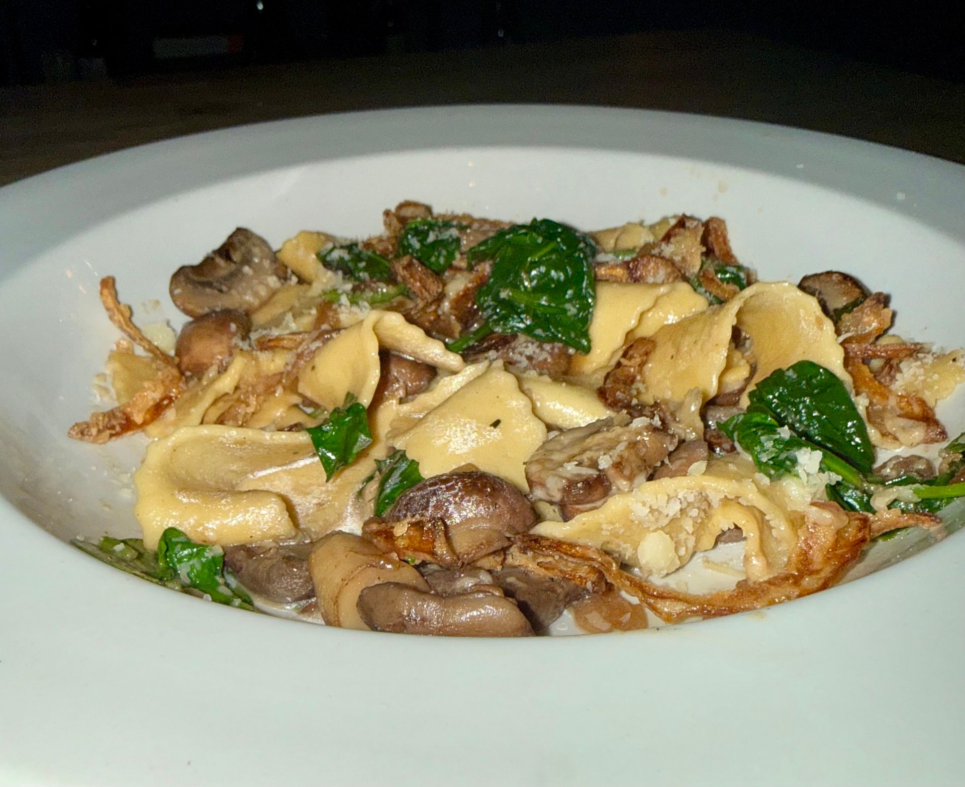 Mike did the sensible thing and ordered the mushroom pappardelle…Crimini mushrooms, caramelized onion, spinach, garlic and crispy onion. The handmade pasta is the real star…tender, silky, and exactly what fresh pasta is supposed to be. The other Pasta Night options — broccoli and sausage fettucine and eggplant rollatini with spinach gnocchetti — sounded equally divine.