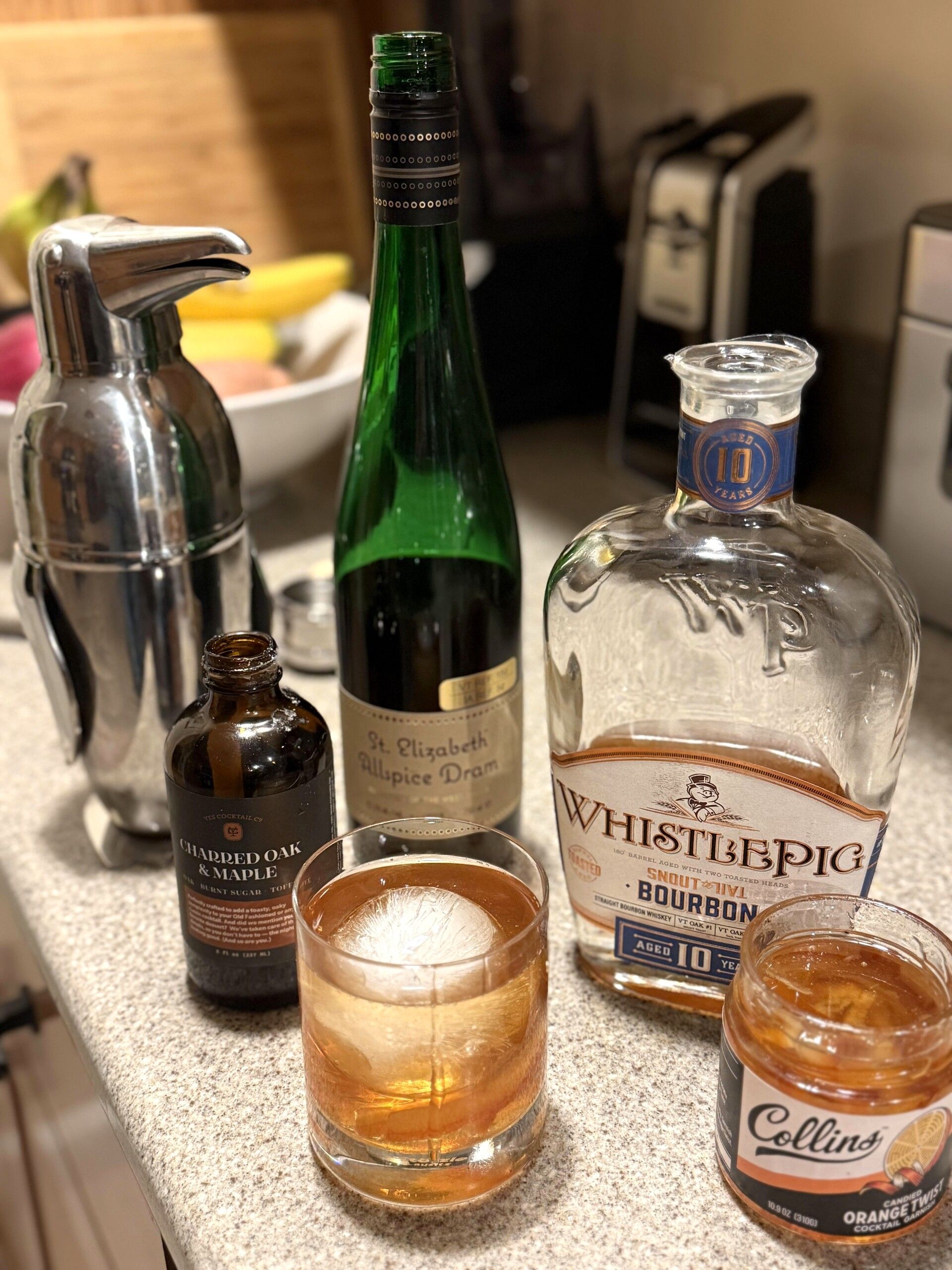 In an unofficial sign that it’s freezing outside, the “penguin” cocktail shaker appeared, and Mike built some sort of a winter Old Fashioned with WhistlePig rye, St. Elizabeth Allspice Dram, charred oak and maple cocktail syrup, a dash of lavender bitters (odd, but it worked), a splash of seltzer and a candied orange garnish. Then he made the same drink for me with Free Spirits bourbon, and suddenly the whole thing shifted: lighter, softer, and proof that the build matters just as much as the spirit.